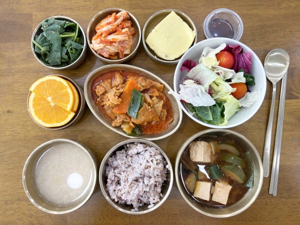 계란찜/ 방풍나물무침/ 김치/ 계절샐러드/