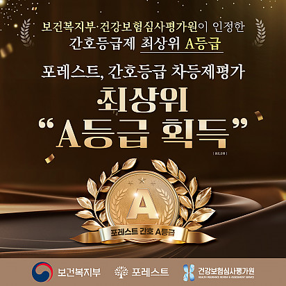 은평 포레스트, 간호등급 최상위 A등급 획득! 포레스트, 간호등급 최상위 A등급 획득!  보건복지부와 건강보험심사평가원이 시행하는 간호등급 차등제 성과평가에서 … 2026.01.14