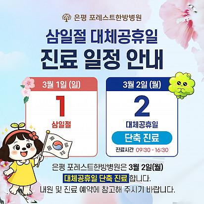 포레스트 삼일절 대체공휴일 진료 안내 안녕하세요, 포레스트입니다  삼일절 대체공휴일 진료(휴진) 일정 안내드립니다. 종로 · 강동 · 강남 · 은평 … 2026.02.24