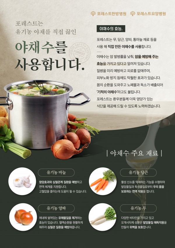 야채수 사용 포레스트는 유기농 야채를 직접 끓인 야채수를 사용합니다^^ 야채수는 암 발병률을 낮춰, 암을 예방해주는 효능을 가지고 있다고 알려져 있습니다. 몸의 순환을 도와주고 노폐물과 독소가 배출되어 '기적의 야채수'라고도 불립니다. 포레스트는 환우분들께 영양가 있는 식단을 제공해 드릴수 있도록 노력하겠습니다. 목록
