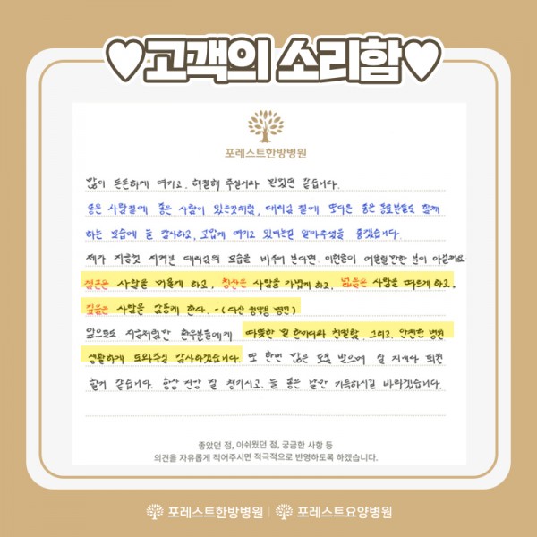 포레스트-고객의소리함 포레스트에 전달된 고객의 소리입니다❣ 겸근은 사람을 머물게하고, 칭찬은 사람을 가볍게하고, 넓음은 사람을 따르게하고, 깊음은 사람을 감동케 한다. (다산 정약용 명언) 감동적인 글귀와 함께 시설관리팀 박준원대리님을 향한 칭찬의 메세지를 보내주셨는데요. 앞으로도 포레스트에서 겪으시는 모든 서비스에 더 만족하실수 있도록 임직원 모두 열심히 하겠습니다. 좋은말씀 감사합니다. 목록