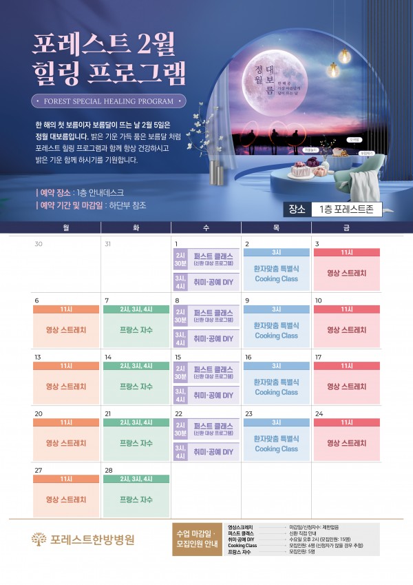 한 해의 첫 보름이자 보름달이 뜨는 날 2월 5일은 정월 대보름입니다. 밝은 기운 가득 품은 보름달 처럼 포레스트 힐링 프로그램과 함께 항상 건강하시고 밝은 기운 함께 하시기를 기원합니다. :)