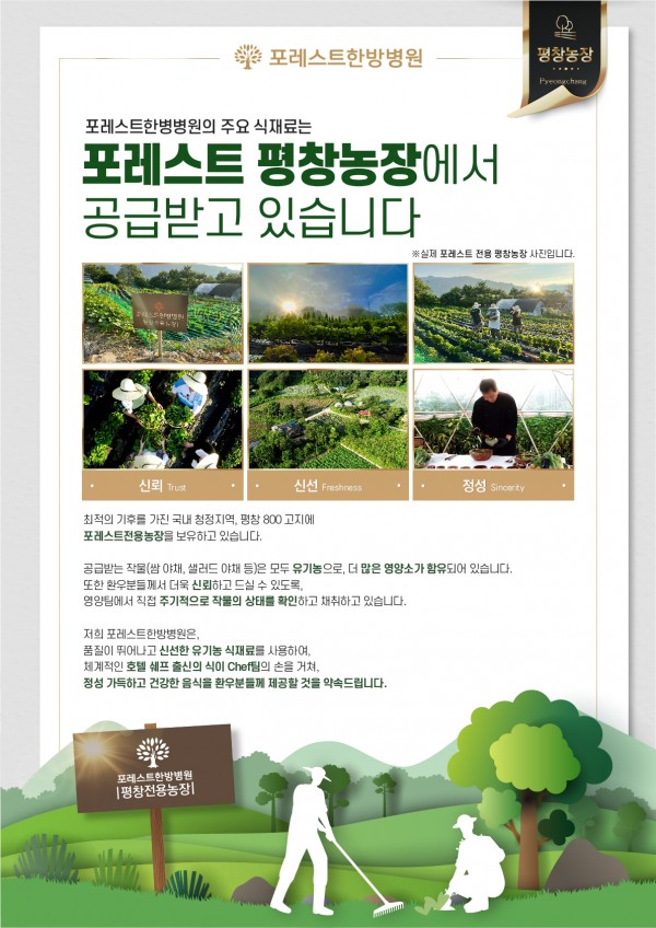 포레스트한방병원 주요 식재료는 전용 평창농장에서 공급받고 있습니다.
