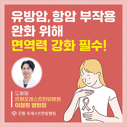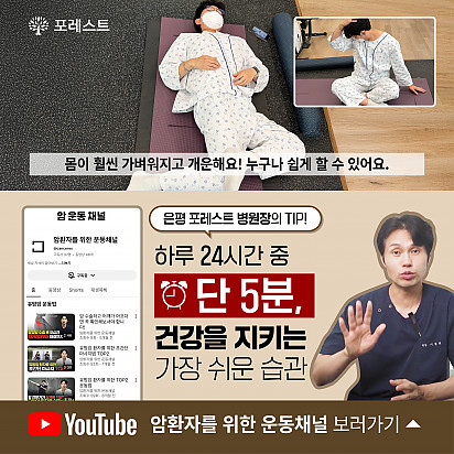 자궁내막암 3기, 박지혜 환우님의 희망일지 ep_1 | 포레스트 환우 이야기 2024.08.08 자궁내막암 3기, 박지혜 환우님의 희망일지 ep_2 | 포레스트 환우 이야기 2024.08.08 자궁내막암 3기, 박지혜 환우님의 희망일지 ep_3 | 포레스트 환우 이야기 2024.08.08 폐암 4기(비소세포암), 서중원 환우님의 희망일지 ep_1 | 포레스트 환우 이야기 2024.08.08 폐암 4기(비소세포암), 서중원 환우님의 희망일지 ep_2 | 포레스트 환우 이야기 2024.08.08 폐암 4기(비소세포암), 서중원 환우님의 희망일지 ep_3 | 포레스트 환우 이야기 2024.08.08 Hot 포레스트 크리스마스 면역 식탁 여러분, 크리스마스는 따뜻하게 보내셨나요? 12월 25일, 포레스트에서는환우분들의 건강과 회복을 응원하는풍성한 크리스… 2025.12.26 Hot [건강정보] 두통에 도움되는 간단한 지압법 소개드립니다. 안녕하세요, 포레스트입니다! ???? 오늘은 두통에 자주 시달리시는 분들을 위해 하루 1분! 가벼운 두통이 있을 때 하면 … 2025.12.10 Hot 은평 포레스트 리뉴얼 완료! 은평 포레스트한방병원이 오랫동안 준비해온 공간 리뉴얼을 마쳤습니다. ※ 새로워진 공간 - 55병상 재구… 2025.12.08 Hot [건강정보]독감, 감기와 달라요! 감기와 독감, 비슷해 보여도 원인·증상·진행 속도 모두 다르다는 사실 알고 계셨나요? 이번 영상에서는 두 질환의 차이를 딱 … 2025.11.25 Hot 암 환자의 절반 이상이 겪는 숨은 적, ‘악액질’ 암 환자의 절반 이상이 겪는 숨은 적, ‘악액질’. 단순히 살이 빠지는 문제가 아니라, 근육이 소모되고 체력이 급격히 떨어지… 2025.11.13 Hot 유방암 항암 부작용 완화, 핵심은 ‘면역력’입니다. 이번 카드뉴스에서는 은평 포레스트 이철희 병원장님이 전하는 ‘유방암 치료 후 회복을 위한 면역 관리법’을 쉽… 2025.11.06 Hot 포레스트 항암식이팀, 2025 코리아 월드푸드 챔피언십 환경부장관상(대상) 수상! 두구두구두구 포레스트 식이 Chef팀이 2025 Korea World Food Championship 라이브경연 부문에서… 2025.11.04 Hot 포레스트의 악액질(Cachexia) 검사와 치료 암 진단을 받고 항암치료 중이거나 수술 후 요양 중이신 분들이라면 잘 먹어도 갑자기 몸무게가 확 빠지는 경험이 있… 2025.10.30 Hot [암환자를 위한 운동 채널] 소개합니다! “영상으로 함께 회복을 시작하세요!” 원내에서도, 집에서도 안전하게 따라할 수 있는 [암환자를 위한 운동 채널]… 2025.10.27 12345 Search 검색대상 제목 내용 제목+내용 회원아이디 회원아이디(코) 글쓴이 글쓴이(코) 검색어 필수