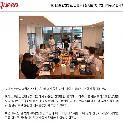 자궁내막암 3기, 박지혜 환우님의 희망일지 ep_1 | 포레스트 환우 이야기 2024.08.08 자궁내막암 3기, 박지혜 환우님의 희망일지 ep_2 | 포레스트 환우 이야기 2024.08.08 자궁내막암 3기, 박지혜 환우님의 희망일지 ep_3 | 포레스트 환우 이야기 2024.08.08 폐암 4기(비소세포암), 서중원 환우님의 희망일지 ep_1 | 포레스트 환우 이야기 2024.08.08 폐암 4기(비소세포암), 서중원 환우님의 희망일지 ep_2 | 포레스트 환우 이야기 2024.08.08 폐암 4기(비소세포암), 서중원 환우님의 희망일지 ep_3 | 포레스트 환우 이야기 2024.08.08 Hot [일간투데이]유방암 환자 큰 폭 증가, 無 증상이 무심코 암 키운다 [일간투데이 이성자 기자] 지난 10년 사이 유방암 환자가 의미 있는 수준으로 늘어났다는 언론 보도가 제기됐다. 유방암은 보통… 2021.05.18 Hot [메디컬투데이]관절 긴장 유발하는 겨울철 심해지는 어깨통증 20대 직장인 A씨는 옷을 입으려 손을 뻗었다 찌릿한 어깨 통증에 금세 손을 내렸다. 그는 아직 나이가 젊어 좀 아프다 말겠지… 2021.05.18 Hot [폴리뉴스]겨울철 남자들의 말 못 할 비밀, ‘전립선’ 질환 남성들에게는 겨울은 시련의 계절이다. 날이 추워지면 우리의 몸은 체온 유지를 위해 땀 배출은 줄이고 체내 수분량은 늘리게 된다… 2021.05.18 Hot [Queen]포레스트한방병원, 크리스마스 맞이 입원 환자 대상 이벤트 진행 포레스트한방병원이 크리스마스를 맞아 환자들을 대상으로 특별 이벤트를 진행했다고 24일 밝혔다. 포레스트한방병원은 의료진… 2021.05.18 Hot [메디소비자뉴스]포레스트한방병원, 암 환자를 위한 '면역특강' 성황 -한ㆍ양방 병행치료, 주치의와 면담 등 호응도 높아…"면역력 관리 중요성 강조" 서울 송파구 방이동에 위치한 포레스트한방… 2021.05.18 Hot [베이비타임즈]추위로 인해 ‘찌릿’한 관절 통증, 치료와 예방법은? [베이비타임즈=송지나 기자] 본격적으로 겨울이 시작되면서 낮은 기온이 연일 이어지고 있다. 이러한 추위는 우리 몸에 영향… 2021.05.18 Hot [메디소비자뉴스]한의사ㆍ호텔 셰프 '밥심 합작품'…환자 '약선식단’이 뜬다 체질에 따라 음식에 한약제 배합으로 면역력 향상…맛ㆍ건강 다잡아 불규칙한 식사 습관으로 건강이 나빠 본적 있는가? 건… 2021.05.18 Hot [Queen]포레스트한방병원, 암 환우들을 위한 ‘면역앤 비타쥬스’ 행사 열려 포레스트한방병원이 지난 23일 암 환자들을 위한 ‘면역앤 비타쥬스’행사를 열었다. 포레스트한방병원 6층 식당에서 80분간… 2021.05.18 Hot [일간투데이]본격적인 겨울 추위 시작...효과 만점 감기 예방법은? [일간투데이 이성자 기자] 아침, 저녁으로 제법 쌀쌀한 기운이 맴돌고 있는 요즘 사람들의 옷차림 역시 점점 두꺼워지며 본격적인… 2021.05.18 21222324 Search 검색대상 제목 내용 제목+내용 회원아이디 회원아이디(코) 글쓴이 글쓴이(코) 검색어 필수
