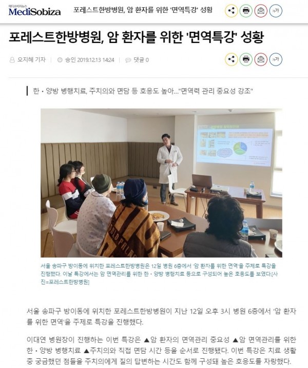 서울 송파구 방이동에 위치한 포레스트한방병원이 지난 12일 오후 3시 병원 6층에서 ‘암 환자를 위한 면역’을 주제로 특강을 진행했다.