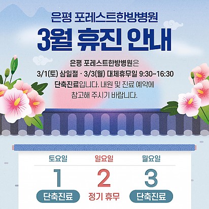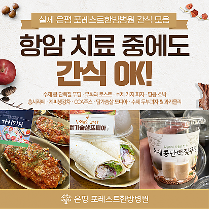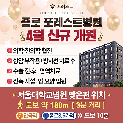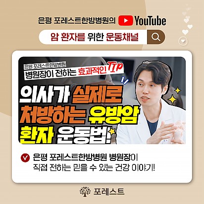 자궁내막암 3기, 박지혜 환우님의 희망일지 ep_1 | 포레스트 환우 이야기 2024.08.08 자궁내막암 3기, 박지혜 환우님의 희망일지 ep_2 | 포레스트 환우 이야기 2024.08.08 자궁내막암 3기, 박지혜 환우님의 희망일지 ep_3 | 포레스트 환우 이야기 2024.08.08 폐암 4기(비소세포암), 서중원 환우님의 희망일지 ep_1 | 포레스트 환우 이야기 2024.08.08 폐암 4기(비소세포암), 서중원 환우님의 희망일지 ep_2 | 포레스트 환우 이야기 2024.08.08 폐암 4기(비소세포암), 서중원 환우님의 희망일지 ep_3 | 포레스트 환우 이야기 2024.08.08 Hot 종로 포레스트병원 OPEN! 봄꽃처럼 화사하게 피어난 종로점 OPEN!! 봄의 시작처럼 가볍고 산뜻하게, 몸과 마음을 위한 나의 공간, 포레스트 종로점이… 2025.04.15 Hot [포레스트 소식]암 환자 한방치료 연구, 학회지에 게재 포레스트의 소식을 전해드립니다. 포레스트 병원장님의 암 환자 대상 한방치료 경험 연구가 ‘대한예방한의학회지’에 정식 게재되… 2025.04.09 Hot 암 환자의 혈당 관리, 왜 중요할까요? ✅ 암 환자의 혈당 관리, 왜 중요할까요? 항암 치료 중 혈당이 상승하는 이유부터, 혈당이 높아지면 어떤 문제가 생기는지, … 2025.04.03 Hot 은평 포레스트한방병원에서 실제 제공된 건강 간식 모음 항암 치료 중에도 간식이 필요하다면? "간식 먹어도 될까?" 고민하는 암 환자분들을 위해 준비했습니다! 은평 포레스트한방병… 2025.03.27 Hot [약채선] 시금치, 아무렇게나 먹으면 오히려 독?! 건강한 섭취법 공개 시금치는 암 예방에 도움을 줄 수 있을까요? 한의학에서는 시금치를 어떻게 바라볼까요? 이번 영상에서는 시금치의 주요 성분과 … 2025.03.20 Hot 유방암 환자를 위한 TOP2 운동법 안녕하세요 포레스트입니다♥ 오늘은 유방암 환우분들을 위한 스트레칭 영상을 소개합니다! 유방암 수술 후 어깨가 자꾸 뻐… 2025.03.12 Hot 은평 포레스트한방병원 둘러보기 은평 포레스트한방병원 둘러보기 :) 환자분들의 편안한 치료와 힐링을 위한 공간, 은평 포레스트한방병원을 소개합니다! … 2025.03.04 Hot 포레스트 3월 진료 안내 안녕하세요, 포레스트입니다. 다가오는 3월 1일(토) 삼일절 및 3월 3일(월) 대체공휴일 진료 일정을 안내드립니다. … 2025.02.20 Hot 은평점 건강 간식 모음 [ 은평 포레스트한방병원 건강 간식 모음 ] 건강은 작은 습관에서 시작됩니다! 포레스트한방병원 은평점에서는 환자분들의 영양… 2025.02.19 12345 Search 검색대상 제목 내용 제목+내용 회원아이디 회원아이디(코) 글쓴이 글쓴이(코) 검색어 필수