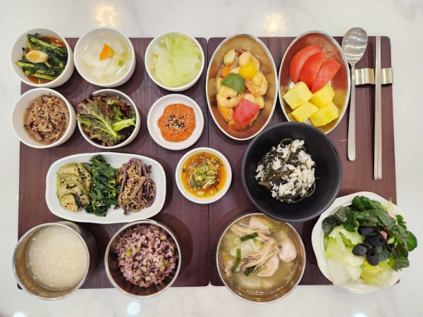 12월 6일 항암식단 [12/6 금요일 중식] 잡곡밥/누룽지/맑은닭곰탕/새우버터갈릭구이/ 곤드레밥(라이브)/우장조림/상추매실청무침/ 호박고지*고사리*방풍/양배추쌈/김치&물김치/ 계절샐러드/파인애플&토마토 목록