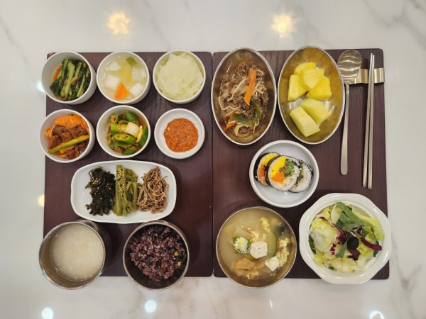 9월 23일 항암식단 [9/23 월요일 중식] 잡곡밥/누룽지/북엇국/팽이버섯소불고기/ 골뱅이초무침/오이고추쌈장무침/ 곤드레*궁채*고비나물/김밥(라이브)/ 김치&물김치/계절샐러드/파인애플*메론 목록