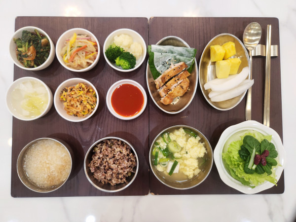 잡곡밥/누룽지/두부계란국/닭보쌈&깻잎,쌈무/
