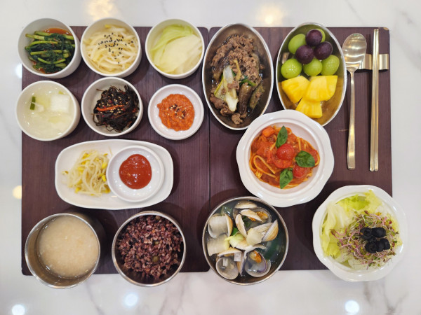 6월 16일 항암식단 [6/16 월요일 중식] 잡곡밥/누룽지/모시조개탕/가지소고기볶음/ 도라지초무침/고추잎고추장무침/토마토파스타(라이브)/ 콩나물무침/양배추쌈/김치&물김치/계절샐러드/ 파인애플&포도 목록