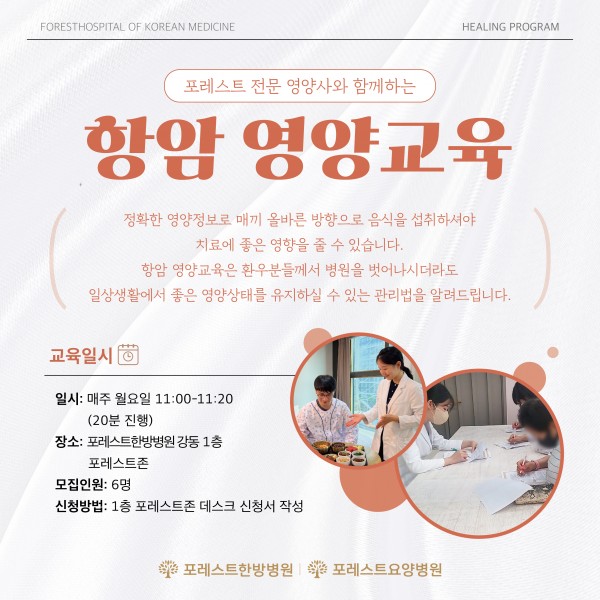 항암 영양교육 전문 영양사와 함께하는 포레스트한방병원 강동 항암 영양교육입니다! 정확한 영양정보로 매끼 올바를 방향으로 음식을 섭취 하셔야 치료에 좋은 영향을 줄 수 있습니다. 항암 영양교육은 환우분들께서 병원을 벗어나시더라도 일상생활에서 좋은 영양상태를 유지하실 수 있는 관리법을 알려드립니다. 포레스트존 데스크에서 신청 하실수 있습니다.❤ 목록