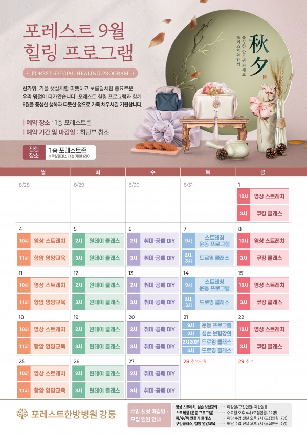 9월 힐링프로그램 포레스트의 9월 힐링프로그램을 소개합니다. 포레스트한방병원, 요양병원은 매달 환우분들의 힐링을 위하여 운동, DIY수업, 쿠킹클래스 등의 프로그램을 진행하고 있습니다. 환우분들께서 포레스트에 계시는 시간들이 더욱 힐링으로 느껴지실수 있도록 더욱 재밌고 유익한 프로그램들을 준비하도록 하겠습니다. 포레스트힐링프로그램과 함께 더욱 행복이 풍성한 9월이 되시길 기원합니다. ❤ 목록