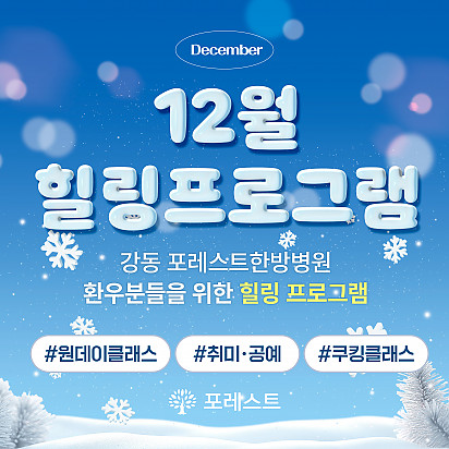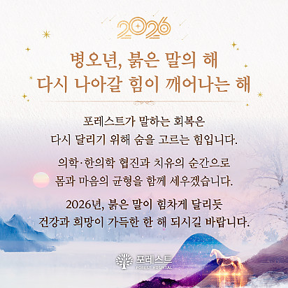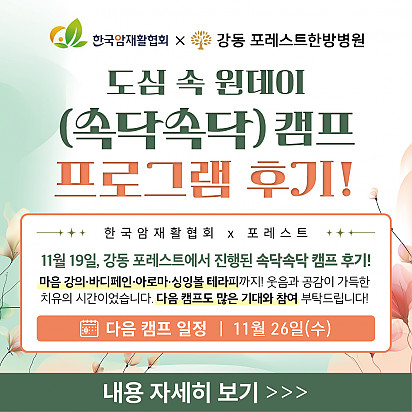 자궁내막암 3기, 박지혜 환우님의 희망일지 ep_1 | 포레스트 환우 이야기 2024.08.08 자궁내막암 3기, 박지혜 환우님의 희망일지 ep_2 | 포레스트 환우 이야기 2024.08.08 자궁내막암 3기, 박지혜 환우님의 희망일지 ep_3 | 포레스트 환우 이야기 2024.08.08 폐암 4기(비소세포암), 서중원 환우님의 희망일지 ep_1 | 포레스트 환우 이야기 2024.08.08 폐암 4기(비소세포암), 서중원 환우님의 희망일지 ep_2 | 포레스트 환우 이야기 2024.08.08 폐암 4기(비소세포암), 서중원 환우님의 희망일지 ep_3 | 포레스트 환우 이야기 2024.08.08 Hot 2026년, 새해 복 많이 받으세요! 지난 한 해 동안 포레스트와 회복의 여정을 함께해 주셔서 진심으로 감사드립니다 2026년 병오년, 붉은 … 2025.12.30 Hot 포레스트 크리스마스 면역 식탁 여러분, 크리스마스는 따뜻하게 보내셨나요? 12월 25일, 포레스트에서는환우분들의 건강과 회복을 응원하는풍성한 크리스… 2025.12.26 Hot 강동 포레스트 힐링프로그램 후기! 강동 포레스트에서는 환우분들을 위한 재미있고 유익한 힐링 프로그램을 진행하고 있습니다. (댄스·원데이 클래스·취미공예·필라… 2025.12.23 Hot 강동 포레스트 12월 연말 특식! 강동 포레스트에서 감사한 마음을 가득 담아 연말·신년 맞이 특별한 식탁을 준비했습니다 특급호텔 출신 Chef팀이 하나하나 … 2025.12.16 Hot [건강정보] 두통에 도움되는 간단한 지압법 소개드립니다. 안녕하세요, 포레스트입니다! ???? 오늘은 두통에 자주 시달리시는 분들을 위해 하루 1분! 가벼운 두통이 있을 때 하면 … 2025.12.10 Hot 12월 강동 포레스트 힐링프로그램 12월 포레스트 힐링프로그램을 소개합니다. 반짝이는 12월, 크리스마스의 기쁨이 가까워지고 있습니다. 차가운 겨울바람 … 2025.12.02 Hot 강동 포레스트, 원예 힐링클래스 후기 강동 포레스트는 11월 24일, 환우분들과 함께 원예 힐링클래스를 진행했습니다. 작은 화분 속 초록빛을 손끝으로 느끼며… 2025.11.27 Hot [건강정보]독감, 감기와 달라요! 감기와 독감, 비슷해 보여도 원인·증상·진행 속도 모두 다르다는 사실 알고 계셨나요? 이번 영상에서는 두 질환의 차이를 딱 … 2025.11.25 Hot 강동 포레스트에서 진행된 속닥속닥 캠프 후기! 11월 19일 강동 포레스트에서 진행된 속닥속닥 캠프! 환우분들의 따뜻한 참여로 더욱 빛났습니다. 마음 강의부터 바디… 2025.11.21 12345 Search 검색대상 제목 내용 제목+내용 회원아이디 회원아이디(코) 글쓴이 글쓴이(코) 검색어 필수