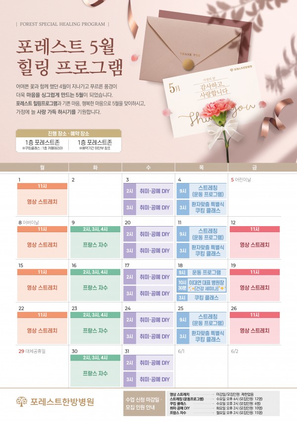 5월 힐링프로그램 푸르른 풍경이 더욱 마음을 싱그럽게 만드는 5월이 되었습니다. 포레스트 힐링프로그램과 기쁜 마음, 행복한 마음으로 5월을 맞이하시고 가정에 늘 사랑이 가득하시기를 기원합니다. :) ▼포레스트의 힐링프로그램▼ ✓영상 스트레치 ✓몸 바로 맘 쉬기 ✓프랑스 자수 ✓취미·공예 DIY ✓운동프로그램 ✓쿠킹클래스 목록