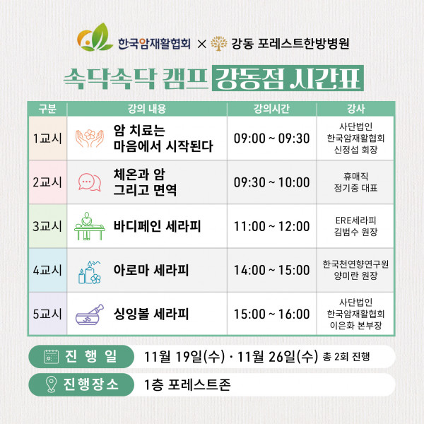 암환우 힐링 프로그램 ‘속닥속닥 캠프’ OPEN! 한국암재활협회 × 포레스트 암환우 힐링 프로그램 ‘속닥속닥 캠프’ OPEN! 암 치료 과정에서 지친 마음을 회복할 수 있도록 포레스트 강동에서 원데이 힐링 프로그램을 진행하고 있습니다. 하루 동안 몸과 마음을 깊이 어루만지는 시간, 속닥속닥 캠프에서 회복의 에너지를 느껴보세요. ✅ 문의 전화 : 포레스트 1899-5868 ✅ 홈페이지 : foresthospital.co.kr ✅ 유튜브 : ‘포레스트병원’ 검색 목록