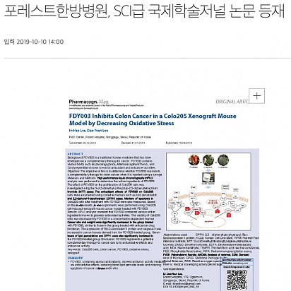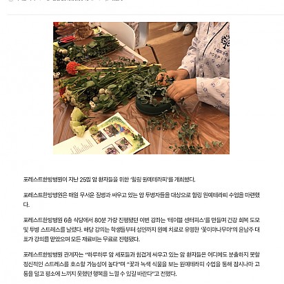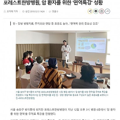 자궁내막암 3기, 박지혜 환우님의 희망일지 ep_1 | 포레스트 환우 이야기 2024.08.08 자궁내막암 3기, 박지혜 환우님의 희망일지 ep_2 | 포레스트 환우 이야기 2024.08.08 자궁내막암 3기, 박지혜 환우님의 희망일지 ep_3 | 포레스트 환우 이야기 2024.08.08 폐암 4기(비소세포암), 서중원 환우님의 희망일지 ep_1 | 포레스트 환우 이야기 2024.08.08 폐암 4기(비소세포암), 서중원 환우님의 희망일지 ep_2 | 포레스트 환우 이야기 2024.08.08 폐암 4기(비소세포암), 서중원 환우님의 희망일지 ep_3 | 포레스트 환우 이야기 2024.08.08 Hot [Queen]포레스트한방병원, 크리스마스 맞이 입원 환자 대상 이벤트 진행 포레스트한방병원이 크리스마스를 맞아 환자들을 대상으로 특별 이벤트를 진행했다고 24일 밝혔다. 포레스트한방병원은 의료진… 2021.05.18 Hot [메디소비자뉴스]포레스트한방병원, 암 환자를 위한 '면역특강' 성황 -한ㆍ양방 병행치료, 주치의와 면담 등 호응도 높아…"면역력 관리 중요성 강조" 서울 송파구 방이동에 위치한 포레스트한방… 2021.05.18 Hot [베이비타임즈]추위로 인해 ‘찌릿’한 관절 통증, 치료와 예방법은? [베이비타임즈=송지나 기자] 본격적으로 겨울이 시작되면서 낮은 기온이 연일 이어지고 있다. 이러한 추위는 우리 몸에 영향… 2021.05.18 Hot [메디소비자뉴스]한의사ㆍ호텔 셰프 '밥심 합작품'…환자 '약선식단’이 뜬다 체질에 따라 음식에 한약제 배합으로 면역력 향상…맛ㆍ건강 다잡아 불규칙한 식사 습관으로 건강이 나빠 본적 있는가? 건… 2021.05.18 Hot [Queen]포레스트한방병원, 암 환우들을 위한 ‘면역앤 비타쥬스’ 행사 열려 포레스트한방병원이 지난 23일 암 환자들을 위한 ‘면역앤 비타쥬스’행사를 열었다. 포레스트한방병원 6층 식당에서 80분간… 2021.05.18 Hot [일간투데이]본격적인 겨울 추위 시작...효과 만점 감기 예방법은? [일간투데이 이성자 기자] 아침, 저녁으로 제법 쌀쌀한 기운이 맴돌고 있는 요즘 사람들의 옷차림 역시 점점 두꺼워지며 본격적인… 2021.05.18 Hot [헬스경향] 포레스트한방병원, SCI급 국제학술저널 논문 등재 포레스트한방병원이 11일 이대연 병원장, 이인희 연구소장의 공동 연구 논문이 9월 SCI급 국제학술지에 등재됐다고 밝혔다. … 2021.05.18 Hot [이투데이] 포레스트한방병원, SCI급 국제학술저널 논문 등재 이대연 포레스트한방병원 병원장과 이인희 연구소장의 공동 연구 논문 ‘Herbal Medicine FDY003 Inhibits … 2021.05.18 Hot [Queen] 포레스트한방병원, 암 환우들을 위한 '힐링원예테라피'개최 포레스트한방병원이 지난 25일 암 환자들을 위한 ‘힐링 원예테라피’를 개최했다. 포레스트한방병원은 매일 무서운 질병과 싸… 2021.05.18 2627282930 Search 검색대상 제목 내용 제목+내용 회원아이디 회원아이디(코) 글쓴이 글쓴이(코) 검색어 필수
