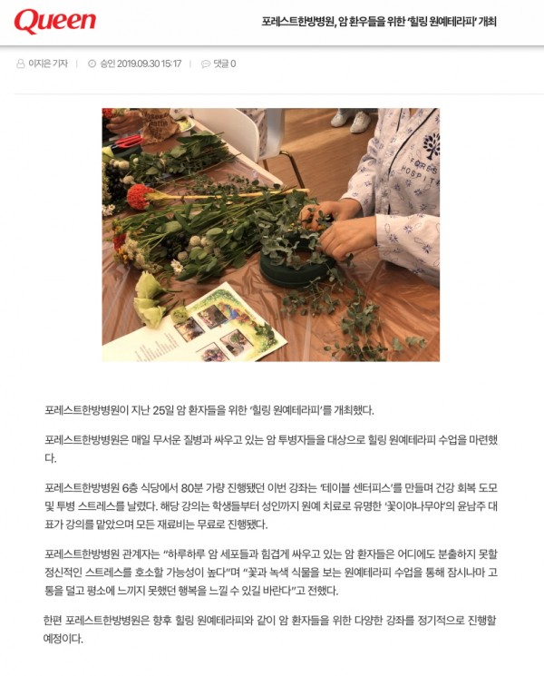 [Queen] 포레스트한방병원, 암 환우들을 위한 '힐링원예테라피'개최