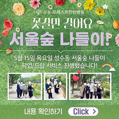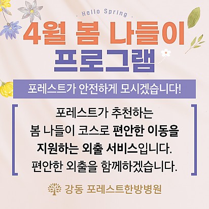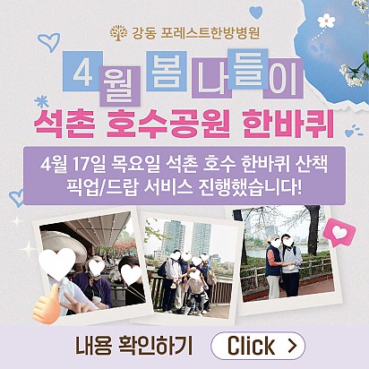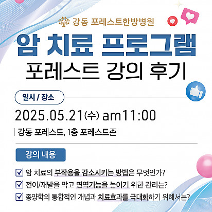 자궁내막암 3기, 박지혜 환우님의 희망일지 ep_1 | 포레스트 환우 이야기 2024.08.08 자궁내막암 3기, 박지혜 환우님의 희망일지 ep_2 | 포레스트 환우 이야기 2024.08.08 자궁내막암 3기, 박지혜 환우님의 희망일지 ep_3 | 포레스트 환우 이야기 2024.08.08 폐암 4기(비소세포암), 서중원 환우님의 희망일지 ep_1 | 포레스트 환우 이야기 2024.08.08 폐암 4기(비소세포암), 서중원 환우님의 희망일지 ep_2 | 포레스트 환우 이야기 2024.08.08 폐암 4기(비소세포암), 서중원 환우님의 희망일지 ep_3 | 포레스트 환우 이야기 2024.08.08 Hot 강동 포레스트 6월 힐링프로그램 안녕하세요 포레스트입니다! 6월, 나라를 위한 희생을 잊지 않는 호국보훈의 달입니다. 고마움의 마음을 담아, 묵념 한 번,… 2025.06.10 Hot 강동 포레스트 암 치료 프로그램 강의 [암 치료, 어렵게만 느껴지셨나요? ] 지난 5월 21일, 강동 포레스트에서는 환우분들과 함께하는 암 치료 프로그램 강의가 … 2025.06.10 Hot 포레스트, 늘 곁에 있는 치료의 이름 안녕하세요 포레스트입니다. 지금까지 약 62,312명 이상의 소중한 환자분들이 포레스트의 진료를 경험하셨습니다. 전국 모… 2025.06.02 Hot 강동 포레스트 봄 나들이 프로그램 [강동 포레스트 봄 나들이 프로그램을 소개합니다] 따뜻한 봄볕 아래, 환우분들과 함께 팔당댐 산책길을 걸었어요 시원한 물결… 2025.05.20 Hot 강동 포레스트와 함께한 신나는 서울숲 나들이! 강동 포레스트와 함께한 신나는 서울숲 나들이! 5월 15일 목요일, 성수동 서울숲에서 환우분들과 함께 초록이 짙어진 숲길… 2025.05.20 Hot [강동 포레스트] 5월 공원 나들이 프로그램 포레스트와 함께 떠나는 5월 공원 나들이 코스! 바람은 산뜻하고, 하늘은 맑은 5월 강동 포레스트에서 추천하는 공원 나들이… 2025.05.13 Hot [강동]5월 힐링프로그램 안녕하세요, 포레스트입니다! 어여쁜 꽃들로 가득했던 4월이 지나고, 초록빛 생명이 가득한 5월이 찾아왔습니다. 2025년 … 2025.05.08 Hot [ 강동 포레스트와 함께한 봄나들이 : 석촌 호수공원 한바퀴 ] [ 강동 포레스트와 함께한 봄나들이 ] 4월 17일, 석촌호수에서 환우분들과 함께 따뜻한 봄 햇살 아래 벚꽃길을 걸었어요.… 2025.04.22 Hot 강동 포레스트한방병원 4월 봄 나들이 프로그램 봄바람 따라 힐링 나들이! 강동 포레스트한방병원 4월 봄 나들이 프로그램 안내 안녕하세요, 강동 포레스트한방병원입니다!… 2025.04.17 678910 Search 검색대상 제목 내용 제목+내용 회원아이디 회원아이디(코) 글쓴이 글쓴이(코) 검색어 필수