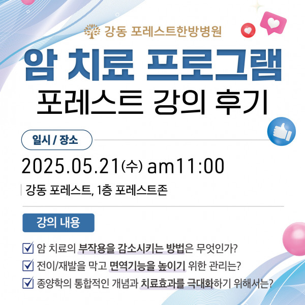 지난 5월 21일, 강동 포레스트에서는 환우분들과 함께하는 암 치료 프로그램 강의가 열렸습니다!