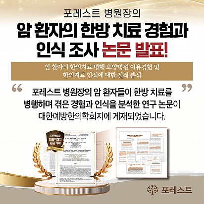 자궁내막암 3기, 박지혜 환우님의 희망일지 ep_1 | 포레스트 환우 이야기 2024.08.08 자궁내막암 3기, 박지혜 환우님의 희망일지 ep_2 | 포레스트 환우 이야기 2024.08.08 자궁내막암 3기, 박지혜 환우님의 희망일지 ep_3 | 포레스트 환우 이야기 2024.08.08 폐암 4기(비소세포암), 서중원 환우님의 희망일지 ep_1 | 포레스트 환우 이야기 2024.08.08 폐암 4기(비소세포암), 서중원 환우님의 희망일지 ep_2 | 포레스트 환우 이야기 2024.08.08 폐암 4기(비소세포암), 서중원 환우님의 희망일지 ep_3 | 포레스트 환우 이야기 2024.08.08 Hot 종로 포레스트병원 OPEN! 봄꽃처럼 화사하게 피어난 종로점 OPEN!! 봄의 시작처럼 가볍고 산뜻하게, 몸과 마음을 위한 나의 공간, 포레스트 종로점이… 2025.04.15 Hot [건강특강] 많이들 잘못 알고 있는 한의학 상식, 한의사가 알려드립니다! 한의학, 아직도 오해하고 계신가요? “한약은 여름에 먹으면 효과가 없다?” “한약과 양약은 함께 복용하면 안 된다?… 2025.04.10 Hot [포레스트 소식]암 환자 한방치료 연구, 학회지에 게재 포레스트의 소식을 전해드립니다. 포레스트 병원장님의 암 환자 대상 한방치료 경험 연구가 ‘대한예방한의학회지’에 정식 게재되… 2025.04.09 Hot [강동]4월 힐링프로그램 안녕하세요, 포레스트입니다! 4월 힐링프로그램을 소개합니다! 푸른 지구를 위한 작은 실천, 더 나은 내일을 위한 한 걸음! … 2025.04.03 Hot 암 환자의 혈당 관리, 왜 중요할까요? ✅ 암 환자의 혈당 관리, 왜 중요할까요? 항암 치료 중 혈당이 상승하는 이유부터, 혈당이 높아지면 어떤 문제가 생기는지, … 2025.04.03 Hot [약채선] 시금치, 아무렇게나 먹으면 오히려 독?! 건강한 섭취법 공개 시금치는 암 예방에 도움을 줄 수 있을까요? 한의학에서는 시금치를 어떻게 바라볼까요? 이번 영상에서는 시금치의 주요 성분과 … 2025.03.20 Hot [강동]힐링프로그램 쿠킹클래스 포레스트 강동점에서 건강하고 맛있는 시간을 준비했어요! ♡직접 구운 고구마 쿠키, 쫀득한 딸기 찹쌀떡, 든든한 베이글 샌드… 2025.03.18 Hot [강동] 포레스트 코어&필라테스 -`♡´-강동 포레스트 코어&필라테스-`♡´- [프로그램 특징] ✔️ 유연성 & 체력 향상 – 부드러운 동작으로 근육의… 2025.03.13 Hot [건강특강] 가벼운 기침? 봄철 미세먼지가 보내는 위험 신호! 봄이 왔지만, 미세먼지 경보! 따뜻한 봄날, 창문을 열고 싶지만 미세먼지가 우리의 호흡기를 위협하고 있습니다. 기침, … 2025.03.07 678910 Search 검색대상 제목 내용 제목+내용 회원아이디 회원아이디(코) 글쓴이 글쓴이(코) 검색어 필수