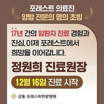 자궁내막암 3기, 박지혜 환우님의 희망일지 ep_1 | 포레스트 환우 이야기 2024.08.08 자궁내막암 3기, 박지혜 환우님의 희망일지 ep_2 | 포레스트 환우 이야기 2024.08.08 자궁내막암 3기, 박지혜 환우님의 희망일지 ep_3 | 포레스트 환우 이야기 2024.08.08 폐암 4기(비소세포암), 서중원 환우님의 희망일지 ep_1 | 포레스트 환우 이야기 2024.08.08 폐암 4기(비소세포암), 서중원 환우님의 희망일지 ep_2 | 포레스트 환우 이야기 2024.08.08 폐암 4기(비소세포암), 서중원 환우님의 희망일지 ep_3 | 포레스트 환우 이야기 2024.08.08 Hot [약채선] 체온 1도 차이가 건강을 바꾼다! 면역력 폭발 제철 항암 식재료, 생강 안녕하세요, 여러분 겨울철, 우리의 몸은 낮아진 체온으로 면역력이 약해지기 쉽습니다. 그런데 체온이 1도만 올라가도 암세포의… 2025.01.07 Hot [건강정보] 파킨슨, 파킨슨증후군, 치매 차이를 알고 계신가요? 파킨슨병, 파킨슨 증후군, 치매. 이름은 익숙하지만 정확히 구분하시나요? 이 영상에서 노년기에 흔히 나타나는 세 가지… 2025.01.02 Hot [강동]1월 힐링프로그램 안녕하세요, 포레스트입니다! 오늘은 2024년 마지막 날입니다. 한 해 잘 마무리하시고 2025년 힐링 프로그램과 함께 새… 2024.12.31 Hot [건강정보]섬망 증상에 대해 알려드립니다! 섬망과 치매, 둘 다 인지 기능에 문제를 일으키지만 전혀 다른 질환입니다! 섬망은 갑작스럽게 나타나며, 원인을 치료하면… 2024.12.26 Hot [힐링프로그램] 원데이 클래스: 나만의 캔들 만들기 강동 원데이 클래스: 나만의 캔들 만들기 강동 포레스트한방병원에서 따뜻한 연말 분위기를 선사할 특별한 클래스가 열렸습니다! … 2024.12.19 Hot 강동 포레스트 의료진 양방 전문의 명의 초빙 [정원희 진료원장] 안녕하세요! 17년간 암 환자와 함께하며 따뜻한 마음으로 희망을 전해온 정원희 진료원장님이 이제 강동 포레스트한방병원에서 진… 2024.12.17 Hot [건강정보]영양성분표 제대로 읽는법2 안녕하세요, 여러분! 암 환자라면 꼭 알아야 할 두 가지, 나트륨과 트랜스지방! 우리가 몰랐던 '나트륨'과 '나쁜 지… 2024.12.12 Hot [강동]11월 29일 쿠킹클래스 포레스트한방병원 강동점에서 진행된 11월 29일 쿠킹클래스는 카스테라 샌드 만들기입니다:) 부드러운 카스테라 빵에 신선한 크… 2024.12.05 Hot [강동]12월 힐링프로그램 안녕하세요! 포레스트입니다:) 강동 포레스트한방병원 12월 힐링프로그램을 소개합니다 찬 바람이 옷깃을 스치는 겨울, 12월… 2024.12.03 678910 Search 검색대상 제목 내용 제목+내용 회원아이디 회원아이디(코) 글쓴이 글쓴이(코) 검색어 필수