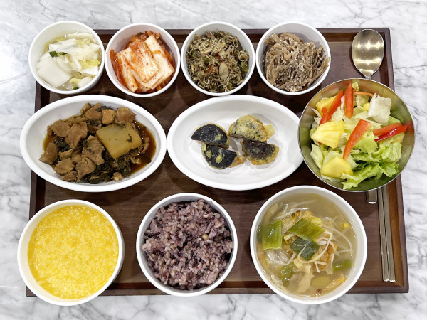 단호박죽/ 잡곡밥/ 황태콩나물국/ 돈육시래기지짐/