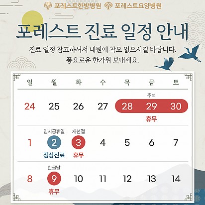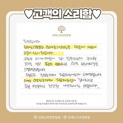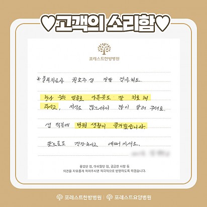Hot 야채수 사용 포레스트는 유기농 야채를 직접 끓인 야채수를 사용합니다^^ 야채수는 암 발병률을 낮춰, 암을 예방해주는 효능을 가지고 있다… 2023.10.19 Hot 가을철에 먹으면 더 좋은 항암 식재료 TOP4 가을철에 먹으면 더 좋은 항암 식재료 TOP4를 소개합니다! 1. 무화과 2. 호박고구마 3. 송이버섯 4. 밤 … 2023.10.17 Hot 고객의 소리함 이번달 포레스트한방병원 강동, 포레스요양병원 강남, 포레스트한방병원 대구점의 전달 된 고객의소리함 모음zip입니다. "밥… 2023.10.12 Hot 10월 힐링프로그램 단풍 물들고 바람 시원한 가읠의 10월이 찾아왔습니다. 환우분들께 가을이 더욱 힐링 되는 계절로 느껴지시도록 준비한 포레스… 2023.10.06 Hot 포레스트요양병원 연합뉴스TV 방영 지난 10월 1일. 포레스트요양병원 강남 조현주 원장님과 포레스트 환우분들의 인터뷰가 연합뉴스TV에 방영 되었습니다. … 2023.10.04 Hot 포레스트 진료일정 안내 포레스트 진료일정 안내 포레스트한방병원·요양병원은 임시공휴일인 10/2(월)에 정상 진료하며, 추석연휴 9/28(목)~9… 2023.09.27 Hot 대만 한의사 협회 방문 지난 9월 18일(월)에 대만 한의사 협회에서 포레스트요양병원 강남점을 방문 해 주셨습니다. 대한한의사협회와 대만한의… 2023.09.26 Hot 포레스트 운동프로그램 2편 포레스트한방병원 강동 최원식물리치료팀장님의 운동프로그램 2편입니다. 이번편에서는 코어운동, 유산소운동을 배워 보실 수 있습니… 2023.09.15 Hot 고객의 소리함 포레스트요양병원 강남점에 전달 된 고객의 소리함입니다. #1 칭찬합니다. 도수실(권효주,한대종) 선생님들 덕분에 치료에… 2023.09.13 678910 Search 검색대상 제목 내용 제목+내용 회원아이디 회원아이디(코) 글쓴이 글쓴이(코) 검색어 필수