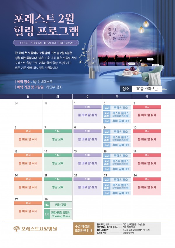2월 힐링프로그램일정 안내 한 해의 첫 보름이자 보름달이 뜨는 날 2월 5일은 정월 대보름입니다. 밝은 기운 가득 품은 보름달 처럼 포레스트 힐링 프로그램과 함께 항상 건강하시고 밝은 기운 함께 하시기를 기원합니다.:) 목록