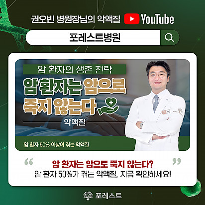Hot 포레스트 크리스마스 면역 식탁 여러분, 크리스마스는 따뜻하게 보내셨나요? 12월 25일, 포레스트에서는환우분들의 건강과 회복을 응원하는풍성한 크리스… 2025.12.26 Hot [건강정보] 두통에 도움되는 간단한 지압법 소개드립니다. 안녕하세요, 포레스트입니다! ????오늘은 두통에 자주 시달리시는 분들을 위해하루 1분! 가벼운 두통이 있을 때 하면 좋을 지… 2025.12.10 Hot [건강정보]독감, 감기와 달라요! 감기와 독감, 비슷해 보여도 원인·증상·진행 속도 모두 다르다는 사실 알고 계셨나요? 이번 영상에서는 두 질환의 … 2025.11.25 Hot 암환우 힐링 프로그램 ‘속닥속닥 캠프’ OPEN! 한국암재활협회 × 포레스트 암환우 힐링 프로그램 ‘속닥속닥 캠프’ OPEN! 암 치료 과정에서 지친 마음을 회복… 2025.11.21 Hot 강남 포레스트 ‘낭독 다독임 클래스’ 따뜻한 현장 후기 강남 포레스트요양병원의 힐링 프로그램 중 많은 분들의 사랑을 받고 있는 ‘낭독 다독임 클래스’ 따뜻한 현장 후기를 소개드립… 2025.11.18 Hot 암 환자의 절반 이상이 겪는 숨은 적, ‘악액질’ 암 환자의 절반 이상이 겪는 숨은 적, ‘악액질’. 단순히 살이 빠지는 문제가 아니라, 근육이 소모되고 체력이 급격히 떨어지… 2025.11.13 Hot 강남점 낭독프로그램 작가 소개 강남 포레스트요양병원에서는 마음의 쉼표를 만드는 낭독 다독임 클래스가 진행 중입니다. 오늘은 함께해주시는 **낭독 작가 ‘… 2025.11.12 Hot 포레스트 항암식이팀, 2025 코리아 월드푸드 챔피언십 환경부장관상(대상) 수상! 두구두구두구 포레스트 식이 Chef팀이 2025 Korea World Food Championship 라이브경연 부문… 2025.11.04 Hot 포레스트의 악액질(Cachexia) 검사와 치료 암 진단을 받고 항암치료 중이거나 수술 후 요양 중이신 분들이라면 잘 먹어도 갑자기 몸무게가 확 빠지는 경험이 있… 2025.10.30 12345 Search 검색대상 제목 내용 제목+내용 회원아이디 회원아이디(코) 글쓴이 글쓴이(코) 검색어 필수