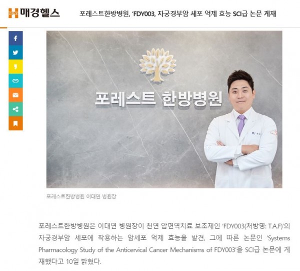 포레스트한방병원은 이대연 병원장이 천연 암면역치료 보조제인 ‘FDY003(처방명: T.A.F)’의 자궁경부암 세포에 작용하는 암세포 억제 효능을 발견, 그에 따른 논문인 ‘Systems Pharmacology Study of the Anticervical Cancer Mechanisms of FDY003’을 SCI급 논문에 게재했다고 10일 밝혔다.