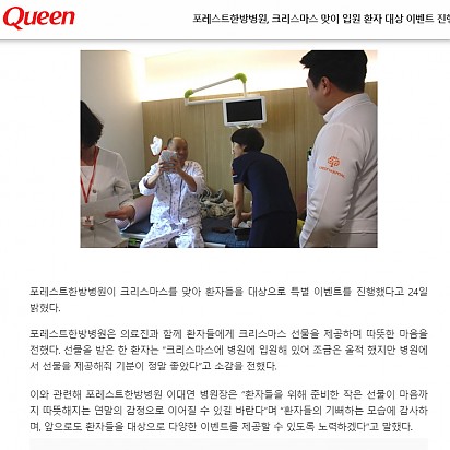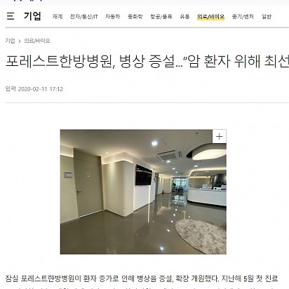 Hot [한국경제] 포레스트한방병원 이대연 병원장, SCI 논문 심사위원 위촉 포레스트한방병원 이대연 병원장이 SCI 학술지 중 암 관련 해외 학회지 ‘Anti-Cancer Agents in Medicin… 2021.05.18 Hot [이투데이]포레스트한방병원, 병상 증설...“암 환자 위해 최선 다해 진료하겠다” 잠실 포레스트한방병원이 환자 증가로 인해 병상을 증설, 확장 개원했다. 지난해 5월 첫 진료를 시작한 이후 8개월 만에 병상 … 2021.05.18 Hot [오가닉라이프신문] 포레스트한방병원, 힐링프로그램 운영 포레스트한방병원이 운영하고 있는 ‘힐링프로그램’이 환자들을 대상으로 높은 호응을 얻고 있다. 포레스트한방병원의 힐링프로그… 2021.05.18 Hot [산업일보]허리 ‘찌릿’하다면, 바로 병원 가야하는 신호 평소 앉아서 업무를 하는 사무직은 잘못된 자세와 습관으로 인해 허리 통증을 느낄 때가 많다. 소위 ‘디스크’라고 알려진 추간판… 2021.05.18 Hot [폴리뉴스]유상철 감독도 걸린 생존율 11% ‘췌장암’, 해결법은? 2002년 월드컵 4강 신화의 주역 유상철 감독이 얼마 전 췌장암 4기 투병 소식을 전하면서 안타까움을 더했다. 췌장암은 발견… 2021.05.18 Hot [일간투데이]유방암 환자 큰 폭 증가, 無 증상이 무심코 암 키운다 [일간투데이 이성자 기자] 지난 10년 사이 유방암 환자가 의미 있는 수준으로 늘어났다는 언론 보도가 제기됐다. 유방암은 보통… 2021.05.18 Hot [메디컬투데이]관절 긴장 유발하는 겨울철 심해지는 어깨통증 20대 직장인 A씨는 옷을 입으려 손을 뻗었다 찌릿한 어깨 통증에 금세 손을 내렸다. 그는 아직 나이가 젊어 좀 아프다 말겠지… 2021.05.18 Hot [폴리뉴스]겨울철 남자들의 말 못 할 비밀, ‘전립선’ 질환 남성들에게는 겨울은 시련의 계절이다. 날이 추워지면 우리의 몸은 체온 유지를 위해 땀 배출은 줄이고 체내 수분량은 늘리게 된다… 2021.05.18 Hot [Queen]포레스트한방병원, 크리스마스 맞이 입원 환자 대상 이벤트 진행 포레스트한방병원이 크리스마스를 맞아 환자들을 대상으로 특별 이벤트를 진행했다고 24일 밝혔다. 포레스트한방병원은 의료진… 2021.05.18 2122232425 Search 검색대상 제목 내용 제목+내용 회원아이디 회원아이디(코) 글쓴이 글쓴이(코) 검색어 필수