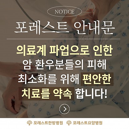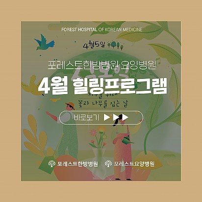 Hot 4월 힐링프로그램 4월의 힐링프로그램입니다. 4월도 다양한 활동들로 힐링클래스를 채웠습니다 :) 환우분들의 많은 관심 부탁드립니다! … 2024.04.02 Hot 포레스트 약채선을 소개합니다 안녕하세요 포레스트입니다 :) 포레스트에서만 확인하실 수 있는, 자연을 담은 항암 약채선(藥菜膳) 소개드립니다~ 카드… 2024.03.19 Hot 3월 힐링프로그램 포레스트의 3월 힐링프로그램을 소개합니다 :)♡ 삼일절의 기운과 시작하는 3월! 환우분들을 위해서 더욱 다양한 프로그램… 2024.03.05 Hot 포레스트요양병원 운정 리뉴얼 개원소식(3월) 기존 서울암요양병원이 3월 "포레스트요양병원 운정점"으로 리뉴얼 개원합니다~ 서울대 의대 소화기 내과교수, 서울대 의… 2024.02.29 Hot 김태륜 원장님을 소개합니다! 포레스트요양병원 강남점의 김태륜 원장님을 소개합니다~ 김태륜 원장님은 양한방 복수면허의 소유자로 입체적인 시야를 통한… 2024.02.27 Hot 포레스트 안내문 : 의료진 파업 관련 안녕하세요 포레스트입니다. 최근 의료계 파업으로 인해, 한시가 급한 가운데 피해를 입고 있는 암 환우분들이 늘어나고 있다는… 2024.02.23 Hot 2월 포레스트요양병원 힐링프로그램 포레스트의 2월 힐링프로그램을 소개합니다☆ 길었던 겨울이 끝나가고 봄을 알리는 입춘(立春)과 설날이 다가오고 있습니다~ … 2024.01.30 Hot 1월 힐링프로그램 포레스트의 1월 힐링프로그램을 소개합니다~! 새해를 맞이하여 더욱 재밌는 클래스들을 준비해보았습니다ㅎㅎ 포레스트의 … 2024.01.09 Hot "포레스트 암세포 자멸 유도 한약제제 한국한의약진흥원장상 수상" 지난 12월 16일, MBN "한의약 미래기술을 찾아라, K-메디슨" 방송편에서 포레스트 한의약기술이 소개되었습니다. 포… 2024.01.05 678910 Search 검색대상 제목 내용 제목+내용 회원아이디 회원아이디(코) 글쓴이 글쓴이(코) 검색어 필수