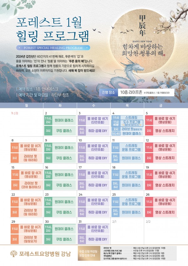 1월 힐링프로그램 포레스트의 1월 힐링프로그램을 소개합니다~! 새해를 맞이하여 더욱 재밌는 클래스들을 준비해보았습니다ㅎㅎ 포레스트의 힐링 프로그램과 함께 청룡의 기운으로 힘차게 시작하시길 바라며, 모든 소망이 이루어지길 기원합니다. 모두 새해 복 많이 받으세요. :) 목록