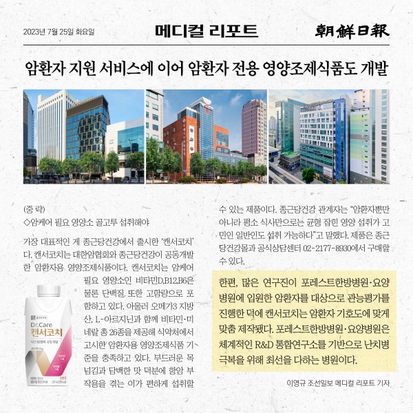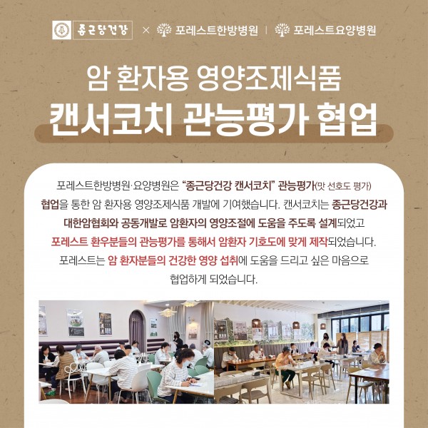 포레스트한방병원·요양병원은 “종근당건강 캔서코치” 관능평가(맛 선호도 평가) 협업을 통한 암 환자용 영양조제식품 개발에 기여했습니다.