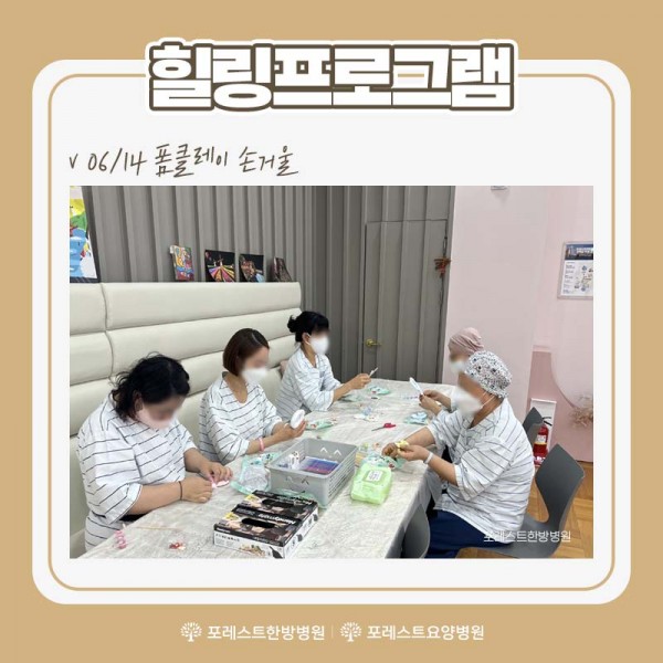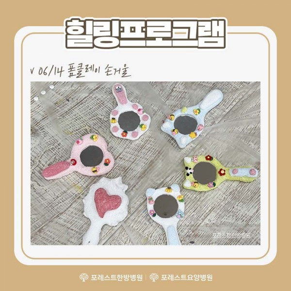 힐링프로그램 DIY 지난주! 포레스트한방병원 강동 포레스트요양병원 강남에서 진행 된 진행된 포레스트 힐링프로그램입니다~!! - 캘리그라피 나만의 엽서만들기 - 폼클레이 손거울 만들기 포레스트에서는 환우분들이 힐링 하실수 있도록 스트레스 완화에 도움이되는 다양한 프로그램을 준비하고 있습니다! 포레스트 힐링프로그램 지금 바로 신청해보세요~! 목록
