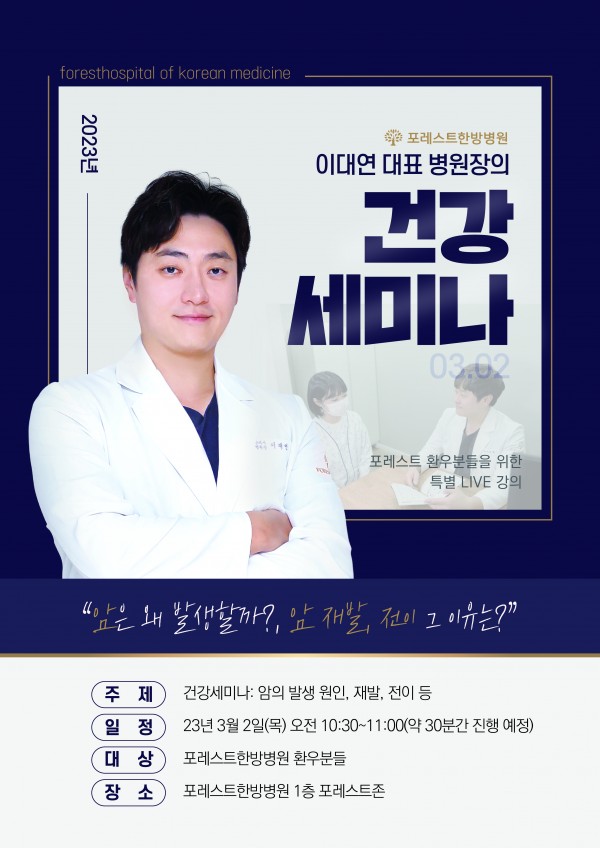 포레스트한방병원·요양병원 환우분들을 위한 이대연 대표 병원장님의 건강세미나가 진행 될 예정입니다!