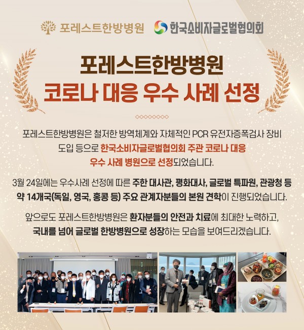 주한대사관, 평화대사, 글로벌 특파원, 관광청 주요 관계자분들의 본원 견학 포레스트한방병원 코로나 대응 우수사례 선정에 따른 주한대사관, 평화대사, 글로벌 특파원, 관광청 주요 관계자분들의 본원 견학 영상입니다. :) 해당 영상은 포레스트한방병원 유튜브 채널에서도 확인하실수 있습니다. ^^ 목록
