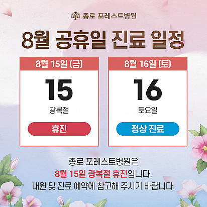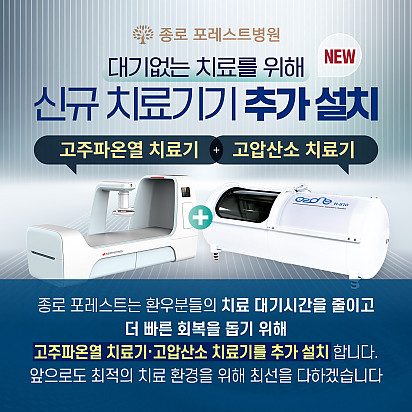자궁내막암 3기, 박지혜 환우님의 희망일지 ep_1 | 포레스트 환우 이야기 2024.08.08 자궁내막암 3기, 박지혜 환우님의 희망일지 ep_2 | 포레스트 환우 이야기 2024.08.08 자궁내막암 3기, 박지혜 환우님의 희망일지 ep_3 | 포레스트 환우 이야기 2024.08.08 폐암 4기(비소세포암), 서중원 환우님의 희망일지 ep_1 | 포레스트 환우 이야기 2024.08.08 폐암 4기(비소세포암), 서중원 환우님의 희망일지 ep_2 | 포레스트 환우 이야기 2024.08.08 폐암 4기(비소세포암), 서중원 환우님의 희망일지 ep_3 | 포레스트 환우 이야기 2024.08.08 Hot 9월 힐링 프로그램 9월 힐링프로그램을 소개합니다! 길어지는 가을밤의 시작, 밤과 낮의 균형을 이루는 추분. 아름다운 계절 가… 2025.08.29 Hot 포레스트 종로점 쿠킹클래스 소식 포레스트 종로점 쿠킹클래스 소식 달콤한 손길, 직접 만들어보는 행복한 한 조각! 종로점 쿠킹클래스에서 진행한 … 2025.08.21 Hot 은평 포레스트 병원장의 마음속 이야기 ”어떻게 해야 아픈 사람의 자리를 덜 외롭고,덜 무섭게 만들 수 있을까?“은평 포레스트 한방병원 이철희 병원장은이 질문을 매일… 2025.08.14 Hot 종로 포레스트병원 치료환경 업그레이드 [종로 포레스트병원 치료환경 업그레이드!] 종로 포레스트병원은 환우분들의 치료 대기시간을 줄이고, 회복 속도를 높이기 위해… 2025.08.12 Hot 포레스트 8월 광복절 휴진 안내 [ 포레스트 8월 광복절 휴진 안내 ] 2025년 8월 15일 (금) 강동 포레스트는 광복절 휴진입니다. 진료 및 내원 … 2025.08.07 Hot 종로점 8월 힐링 프로그램 안녕하세요 포레스트입니다. 2025년 8월 15일은 광복 80주년입니다. 자유와 평화를 위해 희생하신 모든 분들께 깊은 감… 2025.08.01 Hot 이 보라색이 면역력을 살립니다?! 가지에 숨겨진 힘 보라색 채소의 대표 주자, 가지! 그냥 먹으면 손해?! 암 예방에 도움을 줄 수 있는 '파이토케미컬'의 비밀과 가… 2025.07.24 Hot 초복을 담은 포레스트의 여름 밥상 안녕하세요, 포레스트입니다♥ 초복, 여름의 시작을 맞아 정성 가득한 보양식을 준비했습니다. 지친 몸에 활력을, 떨어진… 2025.07.22 Hot 종로·강동 포레스트 힐링 프로그램 후기 안녕하세요, 포레스트입니다♥ 오늘은 종로·강동 포레스트에서 진행된 포레스트만의 DIY 힐링 클래스 소식을 전해드립니다 내… 2025.07.17 12345 Search 검색대상 제목 내용 제목+내용 회원아이디 회원아이디(코) 글쓴이 글쓴이(코) 검색어 필수