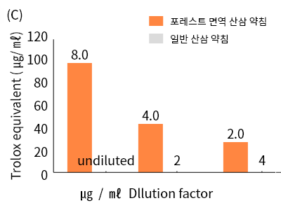 포레스트 면역 산삼 약침 일반 산삼 약침 약재활성도 비교 後 일반 산삼 약침 약재활성도 低(일부 활성도 0), 포레스트 면역 산삼 약침 약재활성도 高.