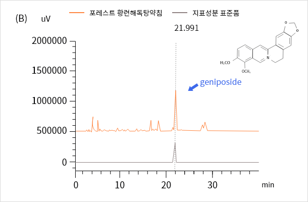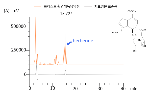 포레스트 황련해독탕 약침 內 황련 지표성분인 berberine 및 치자 지표성분인 geniposide 함량 高.