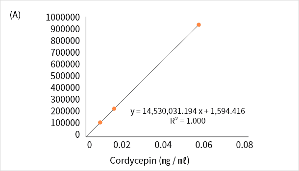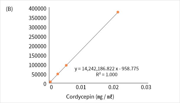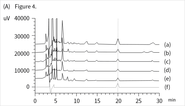 TAF(FDY003)의 유효성분들의 분석 chromatogram, (a) Cordycepin, (b) caffeic acid, (c) 6, 7-dimethylesculetin, (d) chlorogenic acid