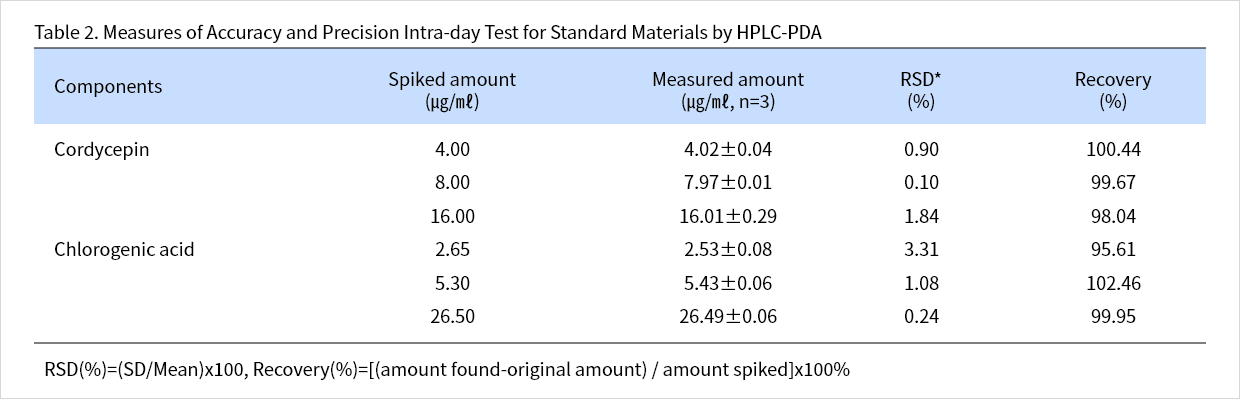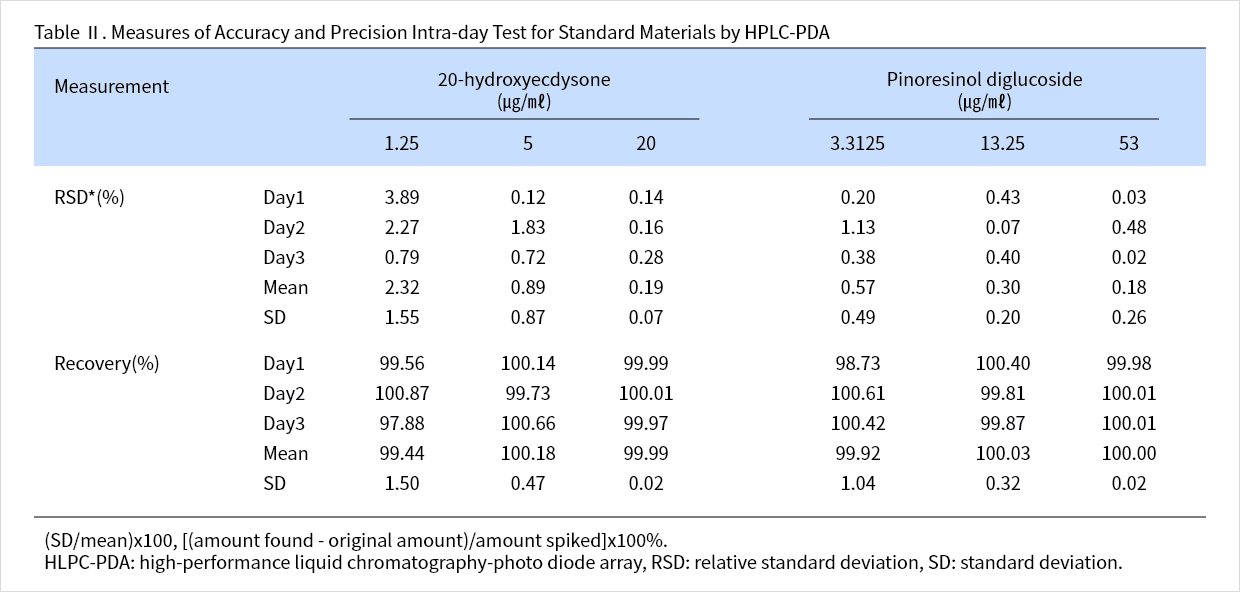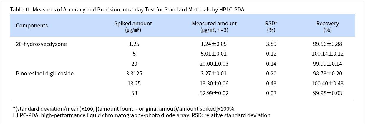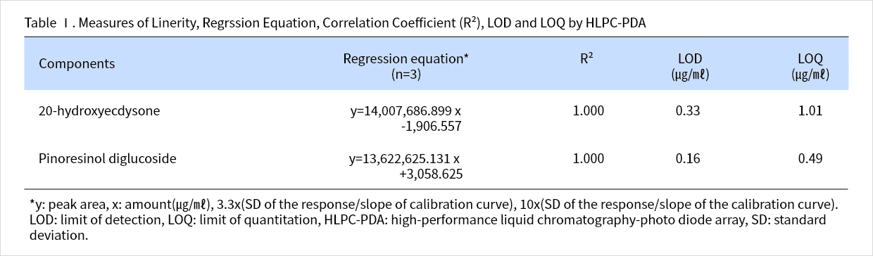 재생약침의 개발 中 추출용매 선정 단계 內 유효성분 우슬의 20-hydroxyecdysone과 두충의 pinoresinol diglucoside의 Method Validation 실험결과 도출.