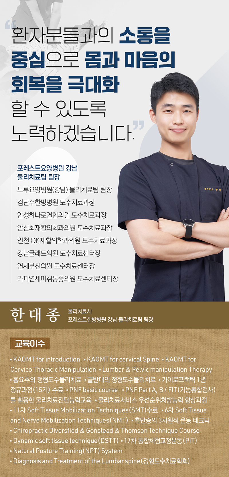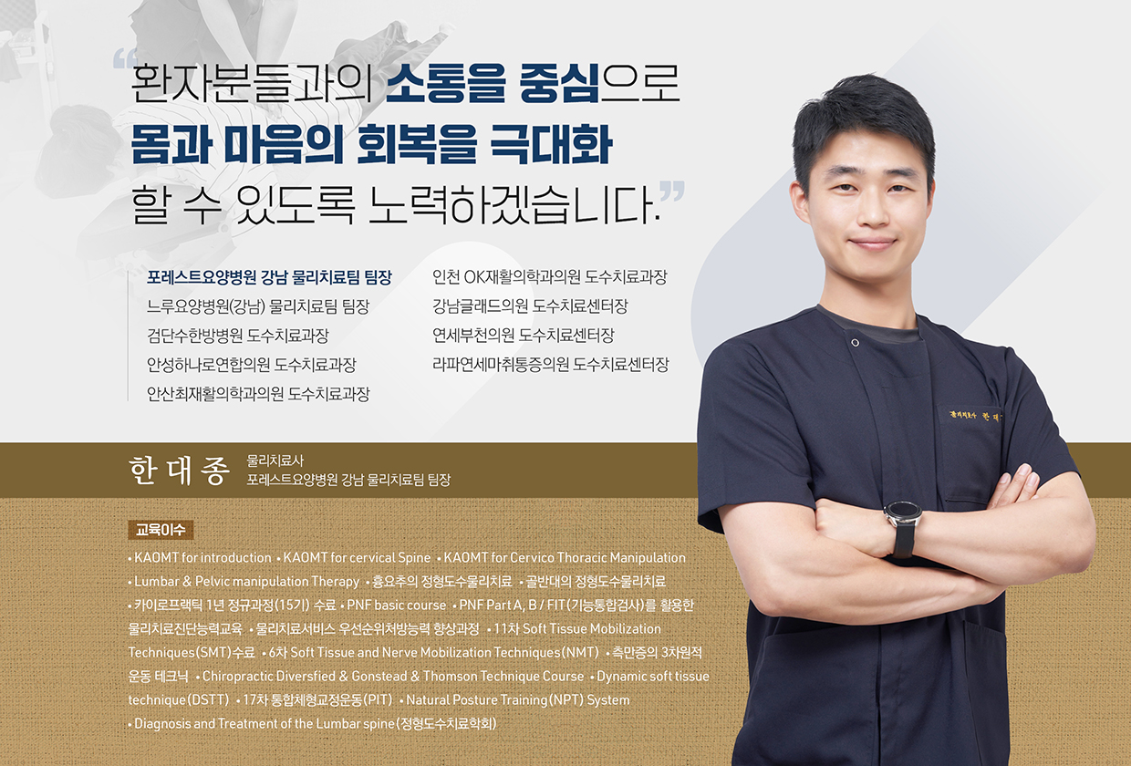 도수·물리·재활치료 수술 및 암종양에 의한 통증을 완화에 도움이 되는 도수·물리·재활치료 오랜 병상활동으로 신체활동 저하, 항암 후 근골격계 기능 저하 등 치료 전 후 다양한 후유증 치료에 도움. 체력 및 기력 저하를 해결하는데 탁월한 효과있음 도수치료는 약물을 사용하지 않는 비침습적 치료로 환자분들의 신체적 부담이 적음 도수·물리·재활치료의 장점 림프도수치료 치료사의 손에 의해 림프순환을 촉진하여 항암 관련 부작용이나 수술 후 림프절 손상으로 인해 생기는 림프순환 장애와 림프액의 축적으로 인한 부종과 통증을 치료 치료효과 림프절 혹은 림프관이 손상된 경우에도 경로를 우회하여 림프액을 흡수하고 부종 예방 교감신경의 진정 효과로 긴장완화와 림프 순환을 촉진 관문조절설에 의해 뇌로 전달하는 통증을 차단하여 통증을 경감 림프순환의 촉진으로 림프절 내의 면역세포가 활성화 정형도수치료 항암 집중 치료 후 생기는 근골격계 통증과 관절의 강직 및 운동 제한, 근육의 경직 및 단축 등 다양한 근골격계 후유증을 치료 치료효과 수술 후 유착된 결합조직이 분해, 분리되어 부드러운 상태로 복구 제한된 가동범위를 증가 시키고 근육을 강화시켜 편안한 움직임 촉진 통증이 감소되고 근육 긴장도를 낮춤 내장기도수치료 내장기 안의 내용물을 움직이고 순환시키고 내장기 주변의 긴장과 유착을 풀어주어 항암 집중 치료 후 생기는 소화불량, 복부 팽만감, 변비, 설사 등 위장장애를 치료 치료효과 수술 후 유착된 내장기 주변을 풀어주어 부드러운 정상기능 상태로 회복 소화불량, 변비 등 위장장애를 해소 운동치료 신체를 움직여 심폐기능 활성화시켜 근력 상승과 피로회복에 도움 신체 활동량을 높여 체력 향상을 이끌며 면역력 상승 효과 치료효과 뻣뻣한 근막을 신장시켜 림프순환을 촉진, 부교감 활성을 유도하여 회복에 도움 전체적인 신진대사를 촉진 예민한 감각을 줄여주어 통증 감소와 운동성 회복에 도움 물리치료 장비 PAIN JAMMER ENS-1140 | 비침습 통증 치료기 피부에 부착한 전극을 통해 뇌로 전달되는 통증 전달 경로를 무통증 신호로 바꿔주는 기구 적외선 치료기 열을 발생시켜 몸 안으로 침투하여 근육의 긴장을 풀고 혈액순환에 도움을 주는 치료장비 TENS | 경피신경자극기 통증 부위에 있는 감각 신경에 물리적 자극을 일정한 간격으로 줌으로써 뇌로 가는 통증 신호를조절해 통증을 줄이는 치료장비